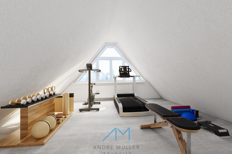 Das großzügige Studio im Dachgeschoss bietet Rückzugsraum für Kreativität oder Entspannung, während der voll unterkellerte Bereich mit Hobbyräumen zusätzlichen Platz für Ihre persönlichen Projekte bietet – sei es als Werkstatt, Fitnessraum oder Heimkino.