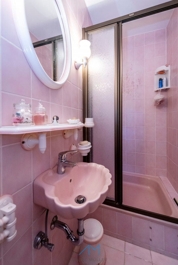 Im Inneren treffen liebevoll erhaltene Stilelemente auf durchdachte Funktionalität. Das Designerbad im Stil der 80er – ein echtes Highlight – und die Möglichkeit, maßgefertigte, handgearbeitete Möbel zu übernehmen, verleihen dem Haus Charakter und Individualität.