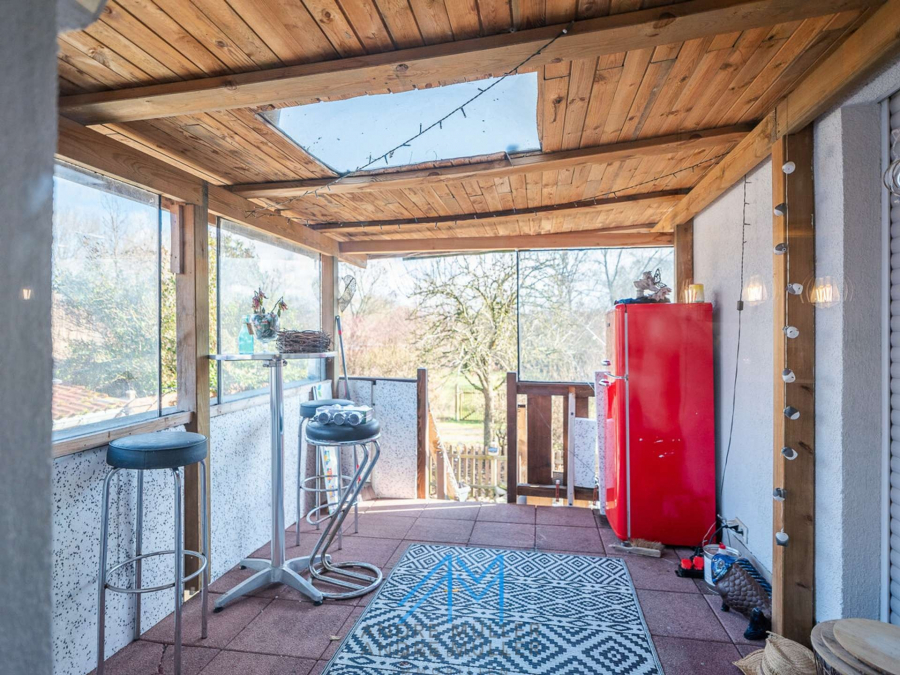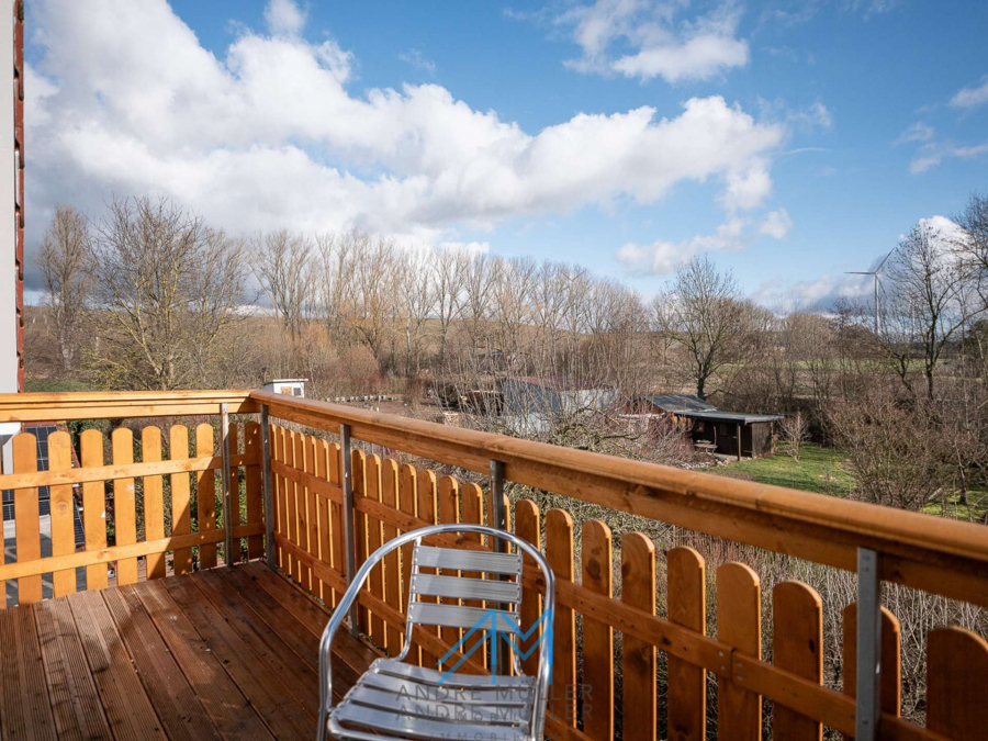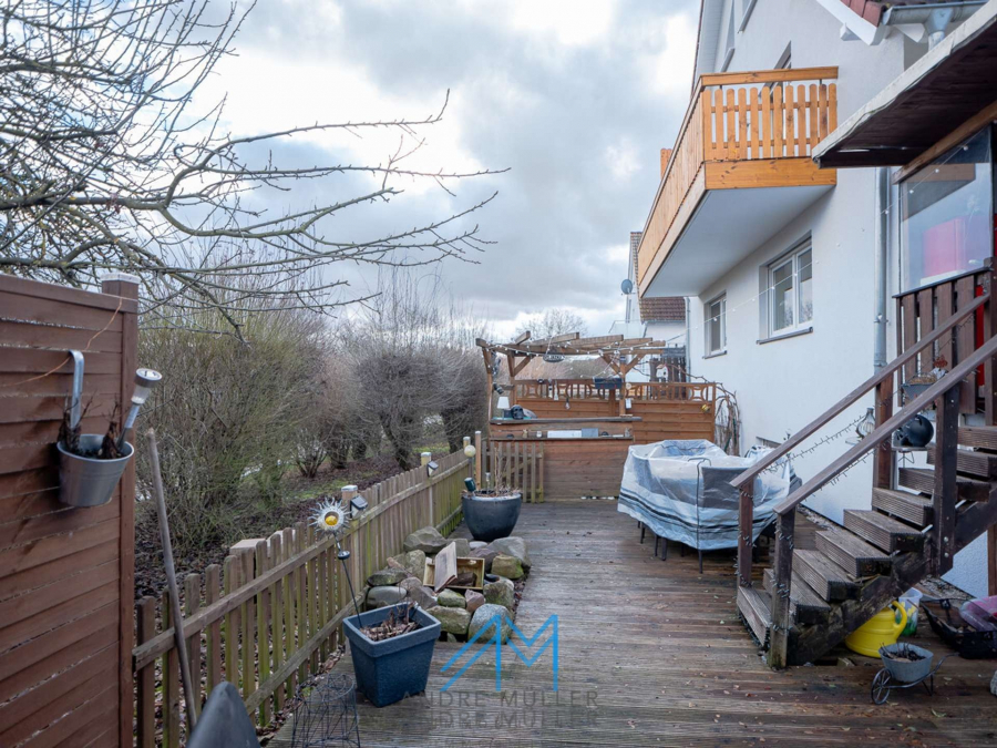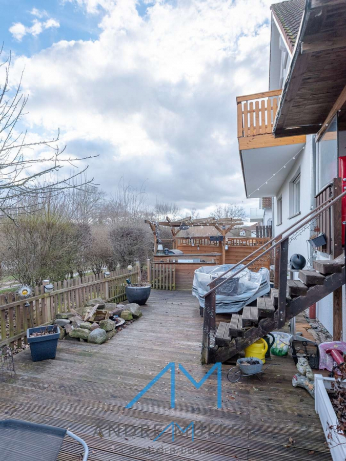 Die in Eigenleistung mit Holz verkleidete Terrasse verspricht idyllische Stunden im Freien und bietet die Möglichkeit, den unteren Bereich bei Bedarf in eine grüne Oase mit Wiese zu verwandeln.